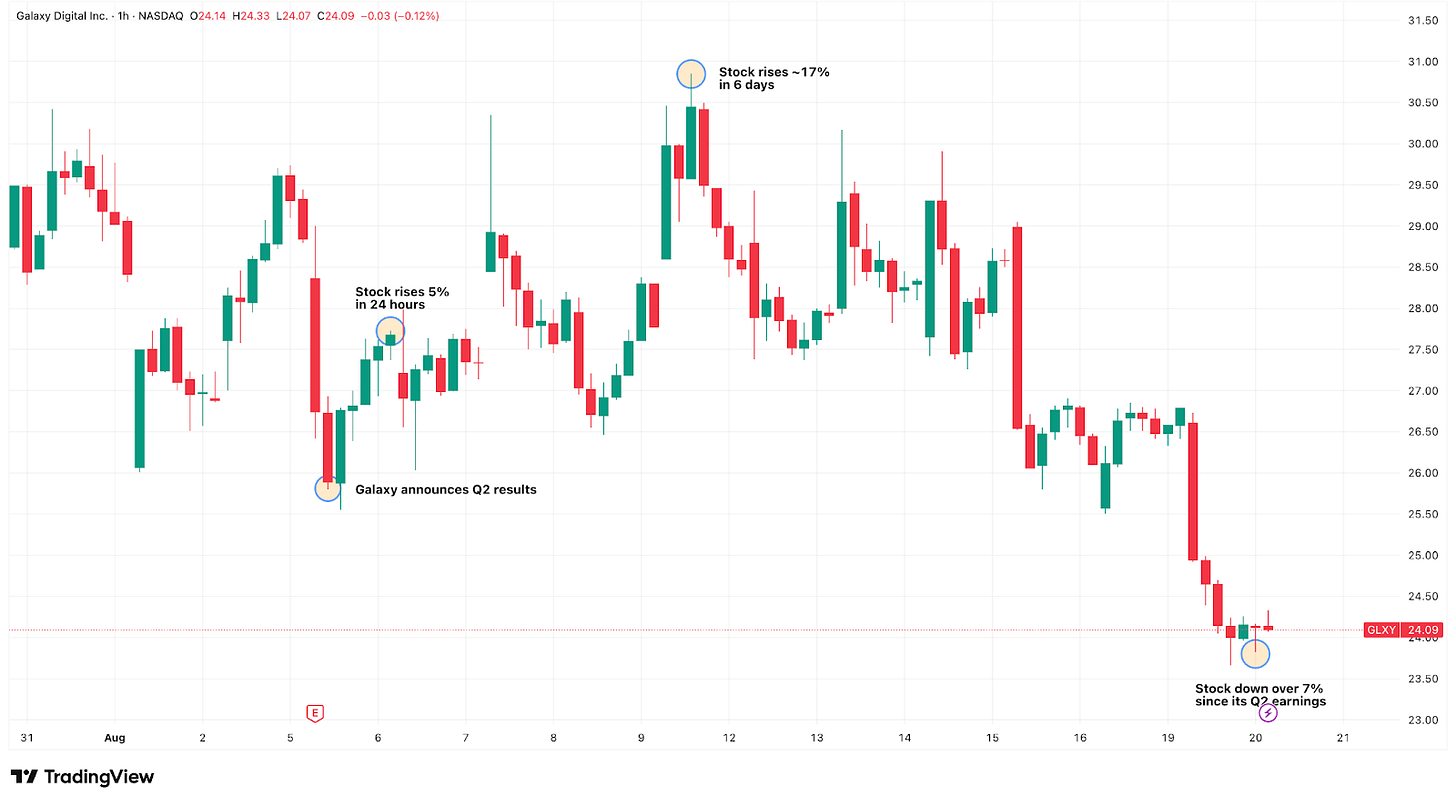 Galaxy's stock recorded a modest 5% gain within 24 hours of announcing its Q2 earnings and went on to jump ~17% within a week before investors pulled out their money.