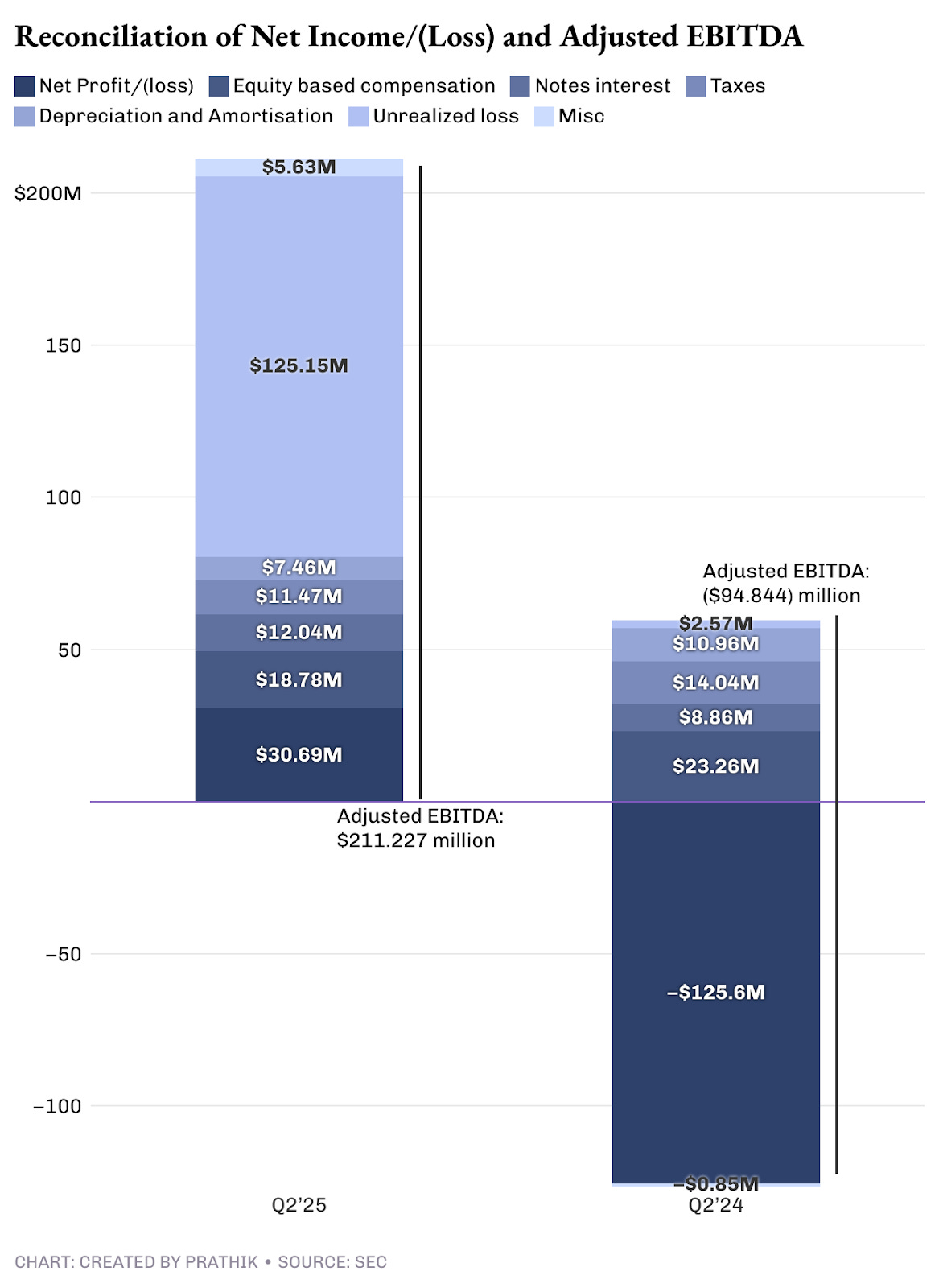 Current model depends on crypto treasury gains ($198M Q2) to fund operations due to capital-intensive trading with minimal returns