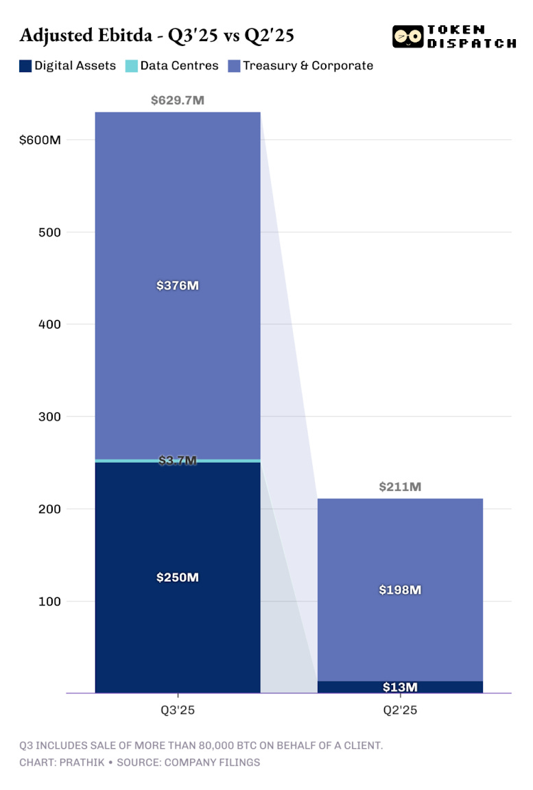 In Q3 ‘25, over 97% of Galaxy’s revenue-generating Digital Assets segment returned an adjusted Earnings Before Interest, Taxes, Depreciation, and Amortisation (EBITDA) of only $250 million, accounting for less than 45% of the total EBITDA.