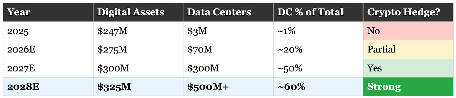 A 24% decline in crypto market cap led to a $482 million net loss, despite impressive operational performance. Such declines would still hurt in 2028, but they would also likely be offset by a more stable data centre revenue that could exceed $500 million.