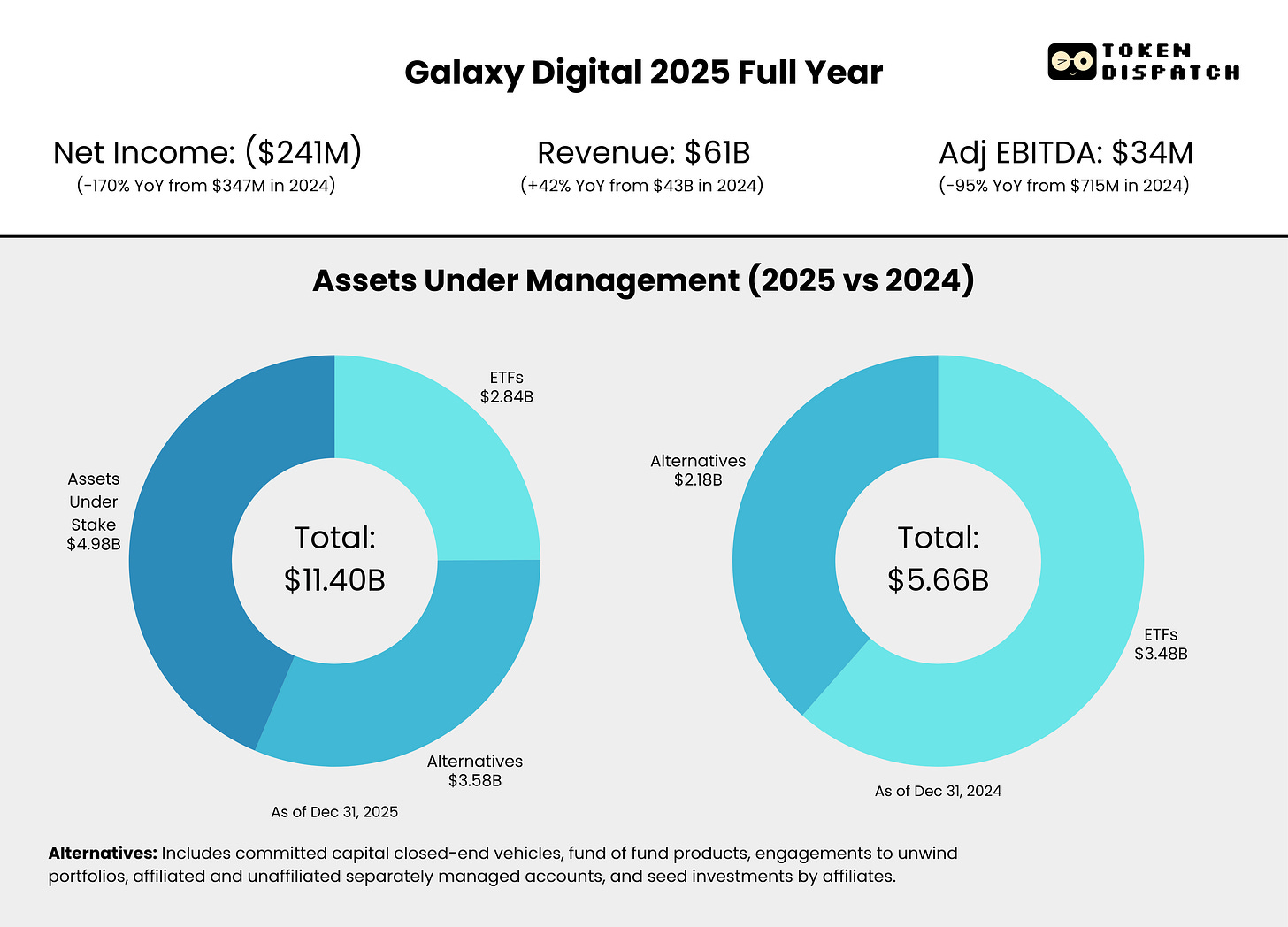 Although Galaxy reported a $482 million net loss in Q4 2025, most of it came from one segment: Treasury & Corporate, where $1.68 billion in crypto holdings were marked down as the market fell by almost 25%. This segment maintains exposure to the digital asset ecosystem through a diversified allocation across spot positions, ETFs, equities, venture investments, private equity, and fund holdings.