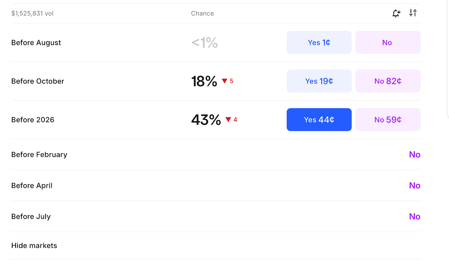 Many markets offer different time horizons for the same event. The Bitcoin $150k market has options for "Before August" (currently <1% chance), "Before October" (18% chance), and "Before 2026" (43% chance).