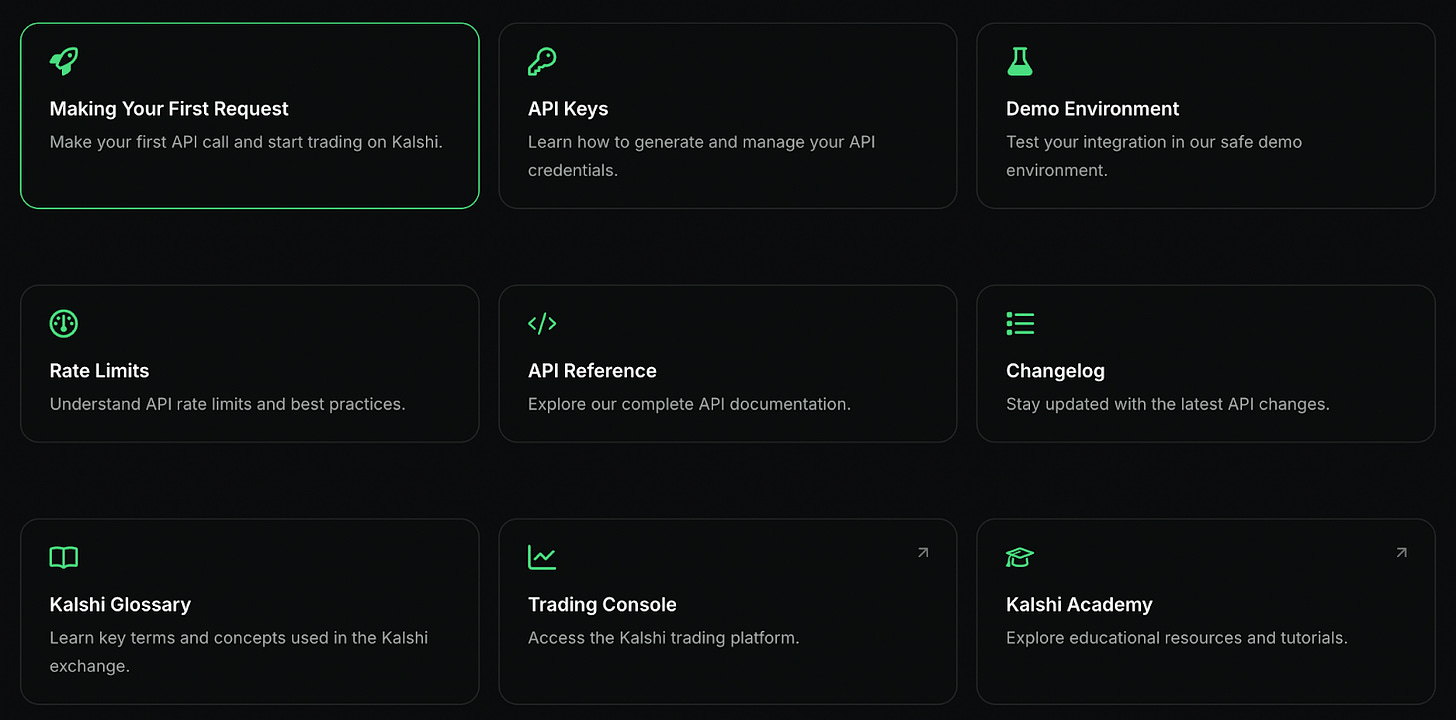For active traders, Kalshi offers API access for algorithmic trading and data analysis. You can pull historical price data, automate trades, and integrate Kalshi markets into broader trading strategies.