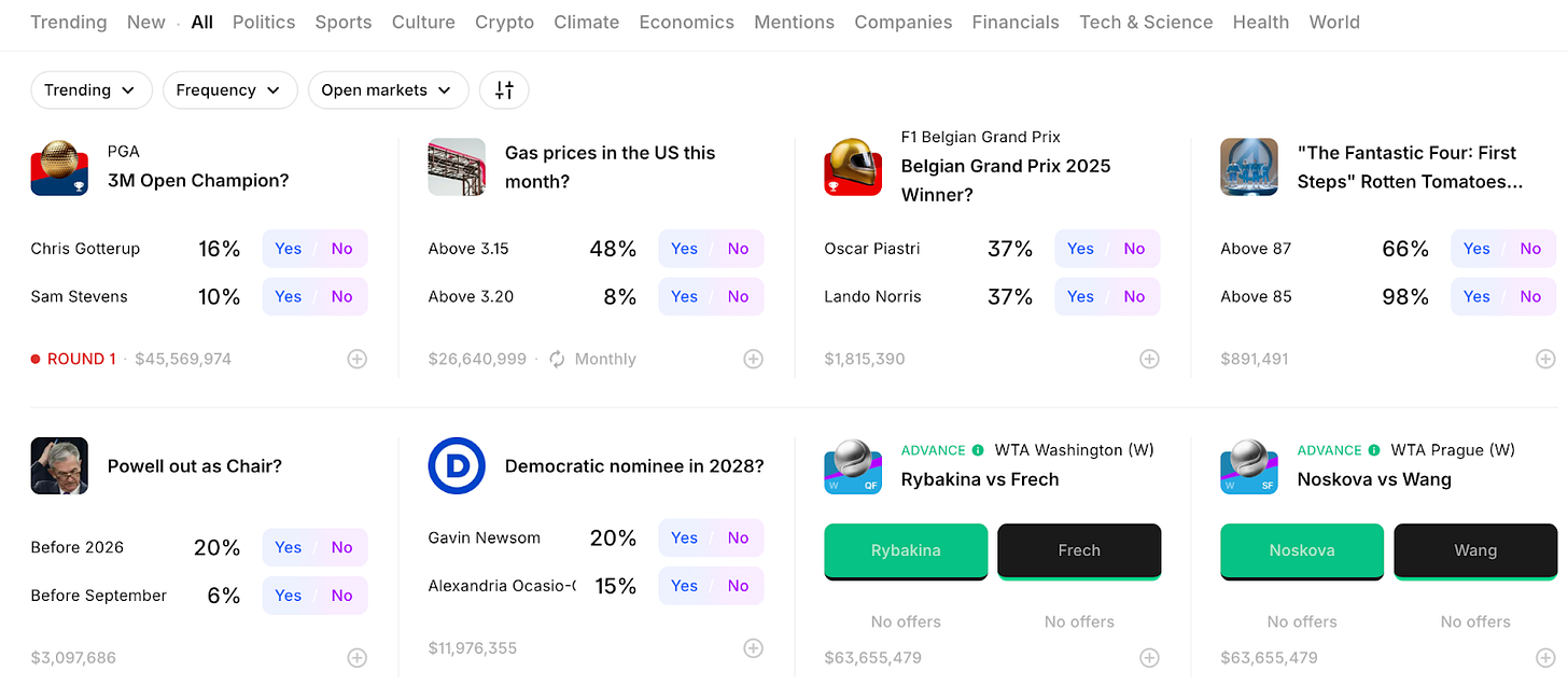 Kalshi organises markets across multiple categories: Politics, Sports, Economics, Crypto, Climate, and more. The trending section highlights markets with high activity or recent price movements.