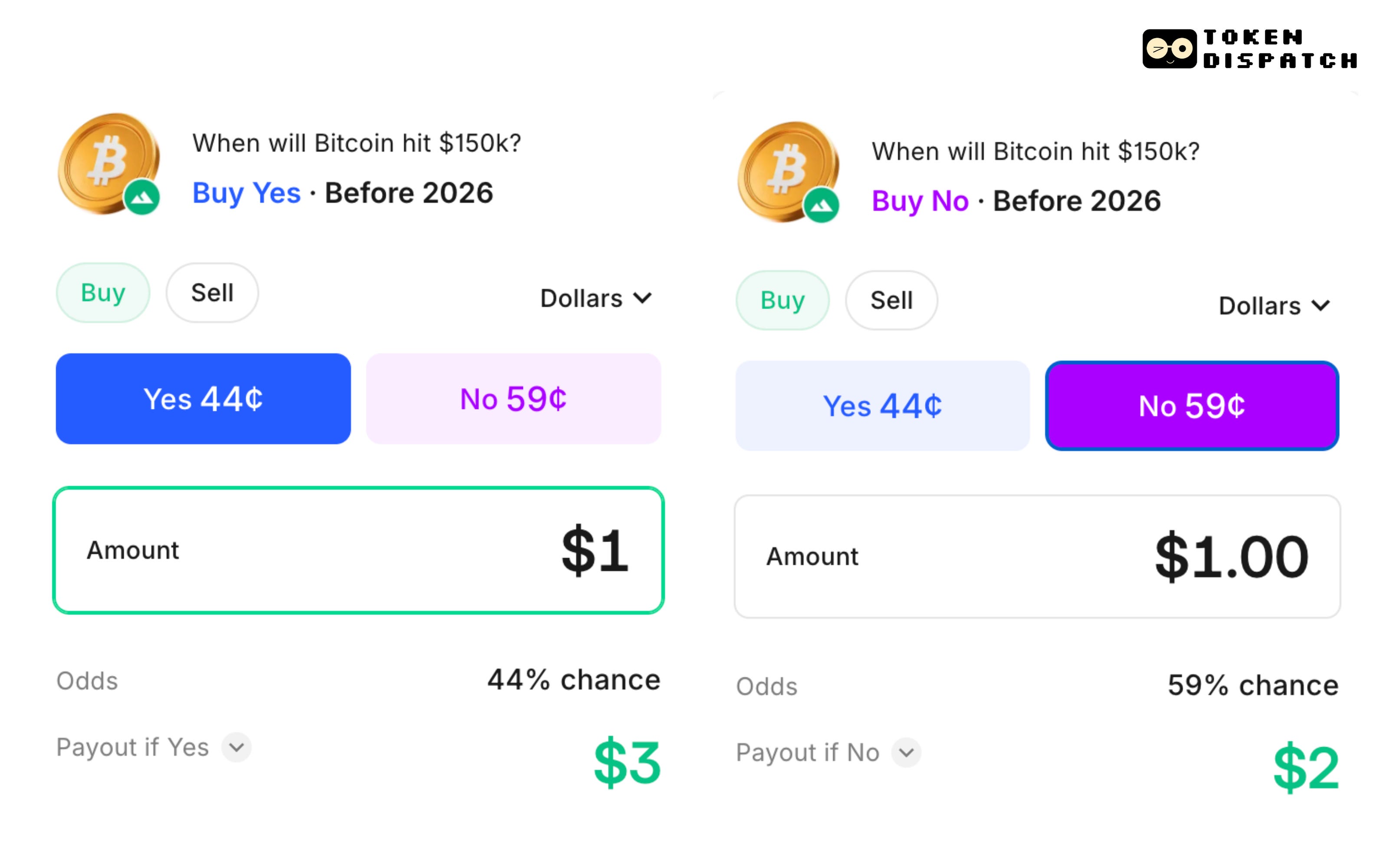 Navigate to any market to see the current pricing structure. Take the current "Will Bitcoin hit $150k before 2026?" market. Right now, "Yes" contracts are trading at 44¢ and "No" contracts at 59¢. This means the market believes there's a 44% chance Bitcoin hits $150k before 2026.
