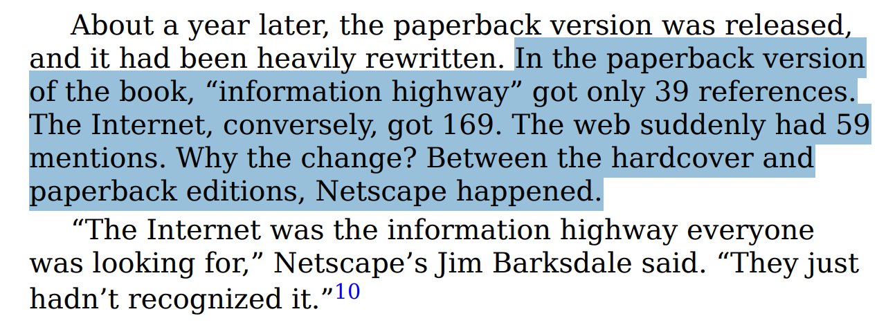 The correction in Gates’s book is one of my favorite details in the entire book. In November 1995, Gates published The Road Ahead, his vision of technology’s future. The hardcover index had 68 references to “information highway” and only 46 to “Internet.” A year later, the paperback was released, heavily rewritten. “Information highway” dropped to 39 mentions. “Internet” shot to 169.
