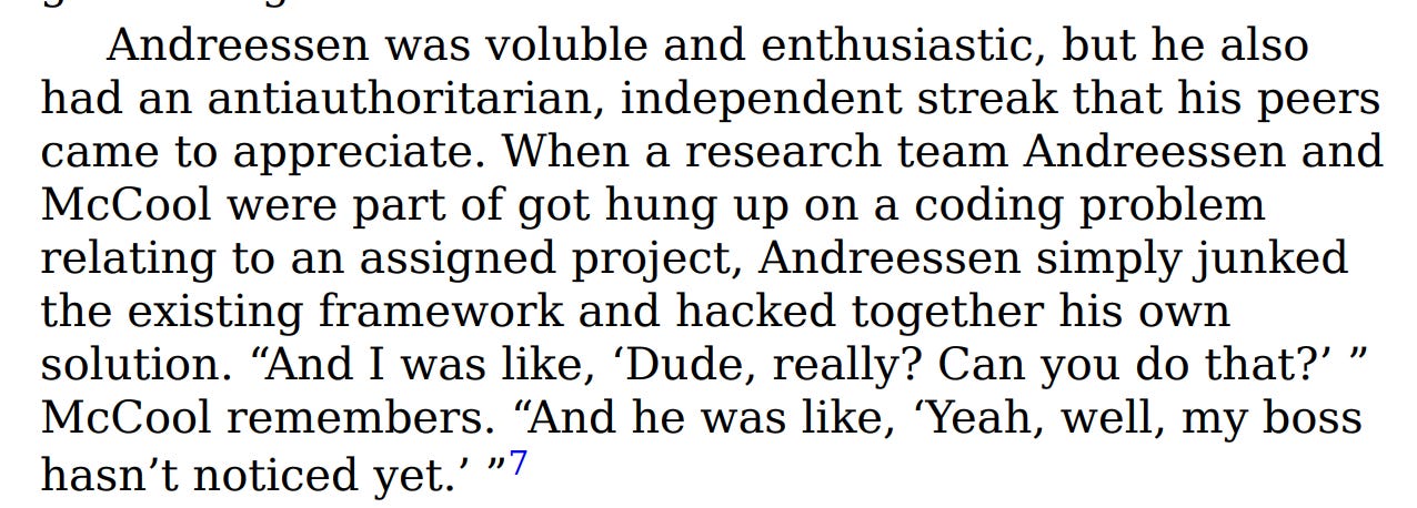 In 1992, Marc Andreessen was a twenty-one-year-old part-time student programmer at the National Center for Supercomputing Applications at the University of Illinois, earning $6.85 an hour. He was large(six feet two), loud, enthusiastic, and allergic to authority. A colleague named Rob McCool remembers meeting him: “All of the computer science students I’d come across were quiet, kind of nerdy types. And here’s this gigantic Scandinavian guy with a purple computer, and he’s wild-eyed and telling me about all this stuff that’s gonna be great.”