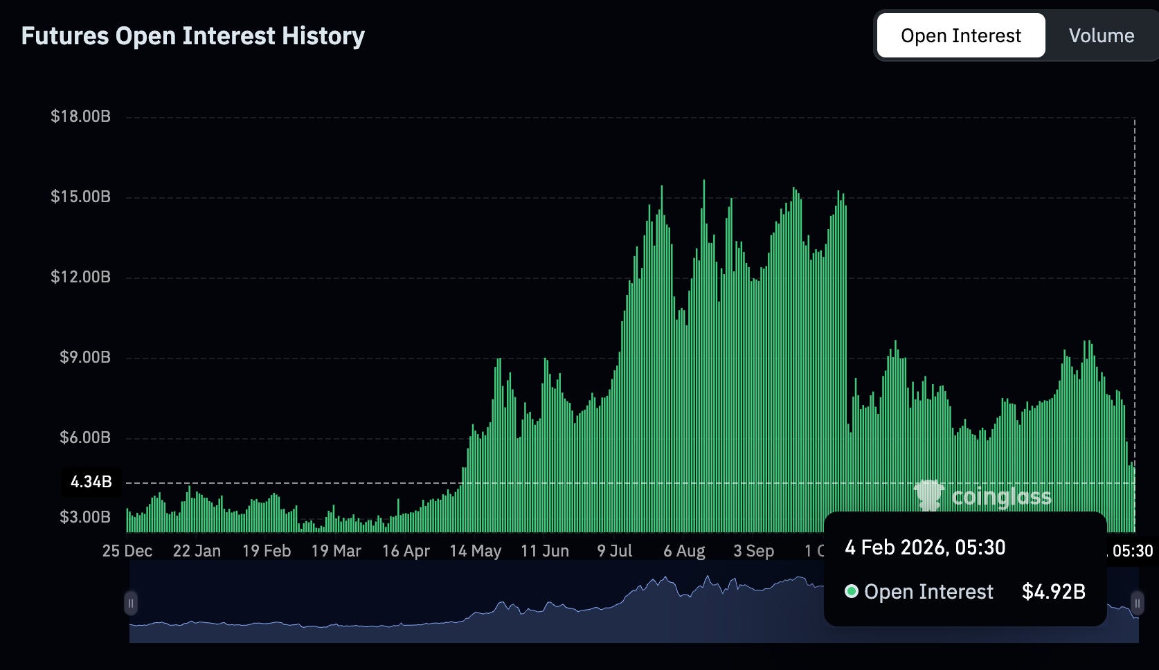 Open interest surged past $1 billion in late 2024, then collapsed. It’s been hovering around $200-400 million since.