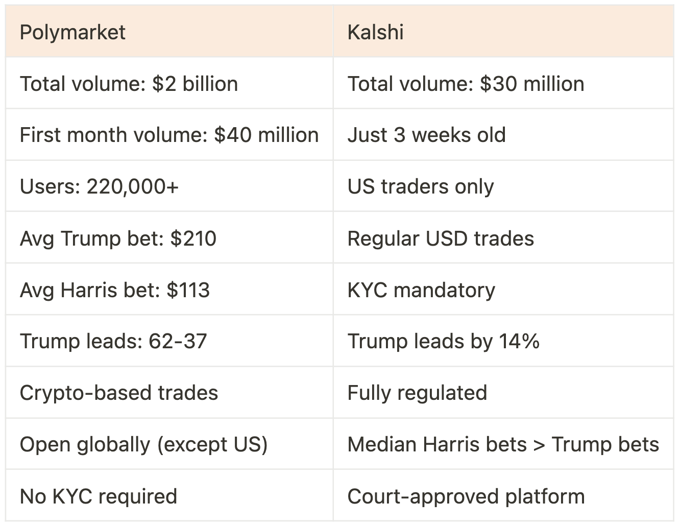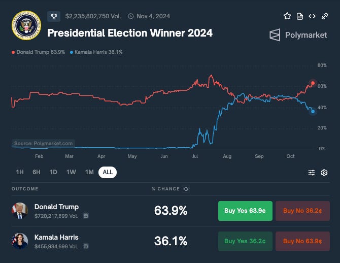 That's Polymarket crushing newcomer Kalshi in presidential prediction market volumes.