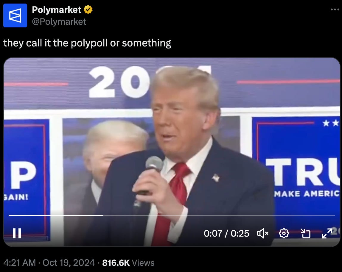 Trump was so happy with betting markets, even tried shouting out Polymarket at his rally ... but called it "Polypoll" instead.