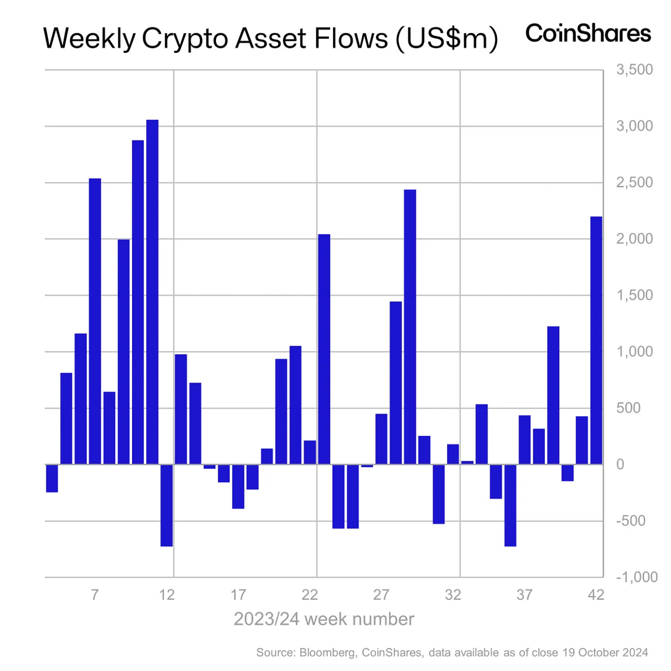 $2.2 billion pumped into crypto funds last week (highest since July)