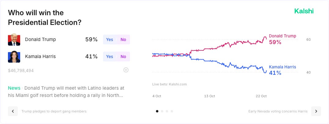 On Kalshi, the median bet size for Harris is larger than that for Trump, suggesting that Trump's odds are not artificially inflated by a few large bets.
