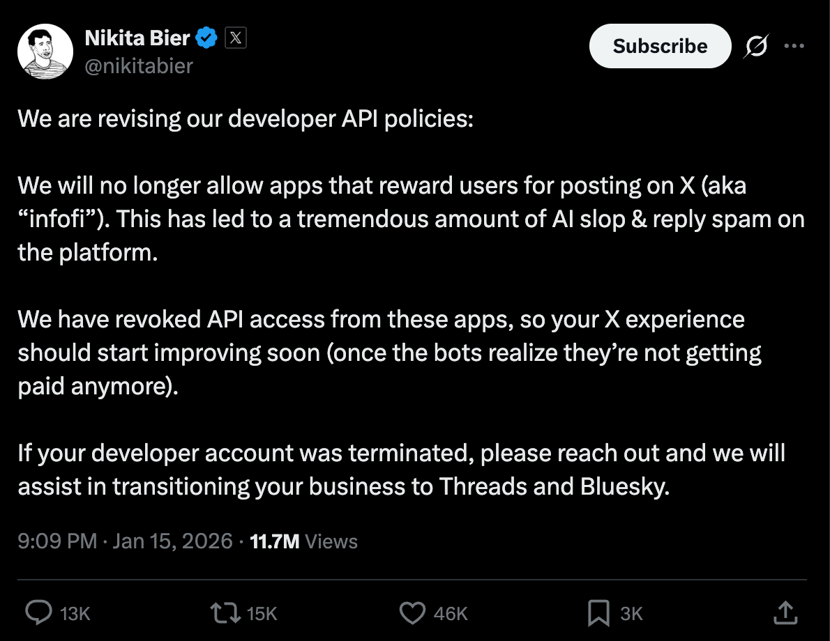 If you ask me, the adoption of AI was the biggest catalyst that led to the ban on InfoFi. The platform scaled up attention monetisation, but the frequency was relatively bearable. But with AI, users can automate the entire process of reading the tweet, drafting a reply and posting it. Feeds have become much more hazy with the fog that is AI slop.