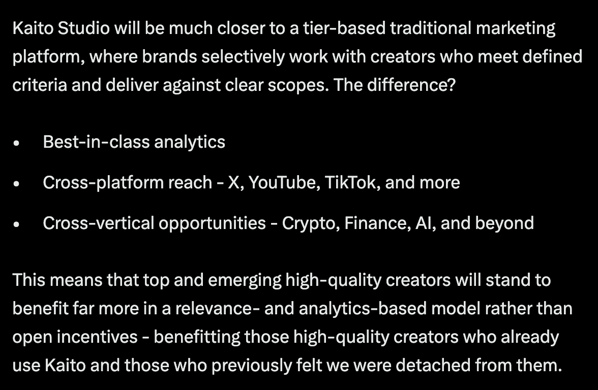 The Kaito system was to monetise attention. Projects pay creators to capture the audience’s attention towards them. The more attention they can capture, the more valuable they are to the project and thus the more potential payouts they can get.