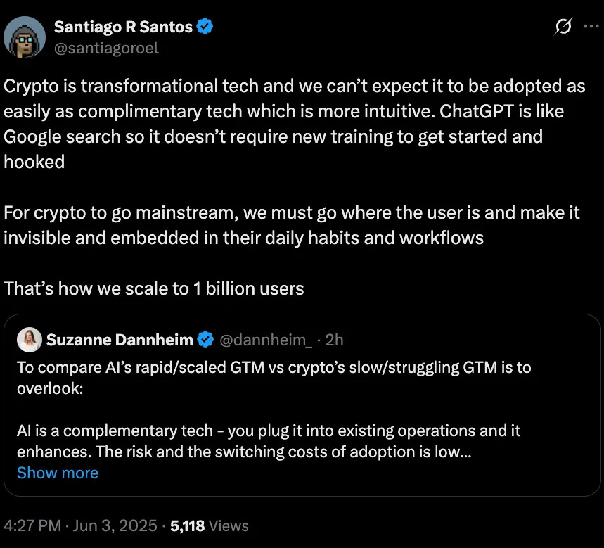 The billion-user moment won't come from better UX alone, but from making blockchain so seamless users don't know they're using it.