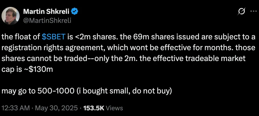 The catch: Float situation is the context. Martin Shkreli pointed out that only 2 million shares are actually tradable right now, despite 69 million new shares being issued. Most of them are locked up pending SEC registration. Massive demand chasing very few shares — explaining both the rally and the inevitable crash.