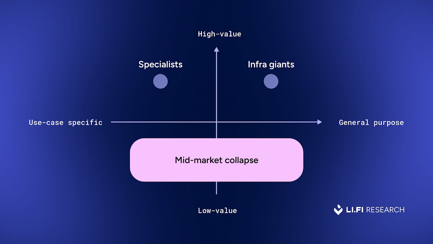 Think SWIFT in banking, Visa in payments, or AWS in cloud computing. In interop, large platforms that power many apps, wallets, and chains sit here. This includes the likes of LI.FI, LayerZero, and Wormhole.