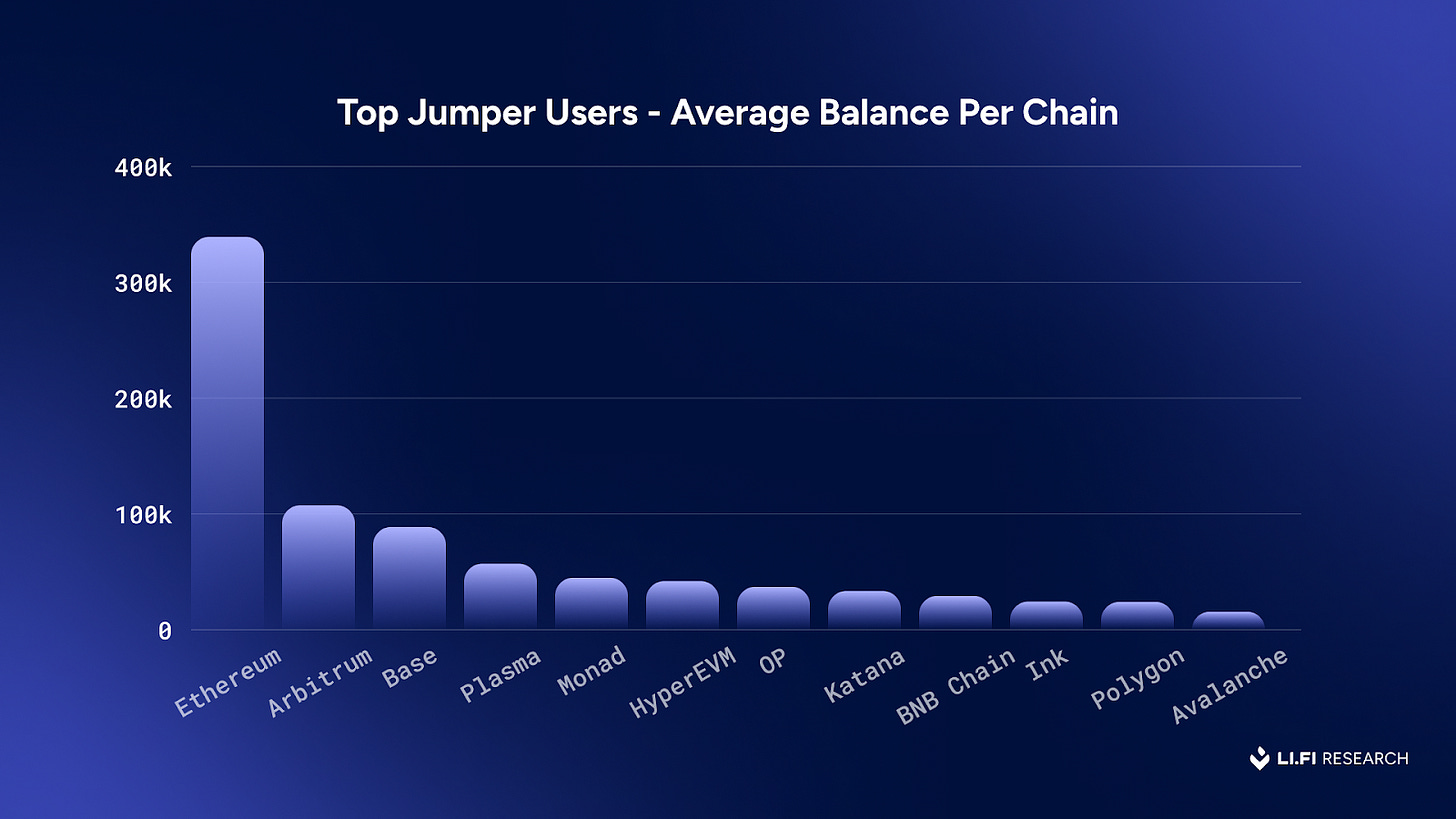 Data from high-activity cross-chain users of Jumper, a multi-chain swapping and bridging exchange, illustrates this shift. Most users distribute their funds across several chains. They tend to park the majority of their capital on one or two primary networks, then move smaller amounts elsewhere when the market presents an opportunity.