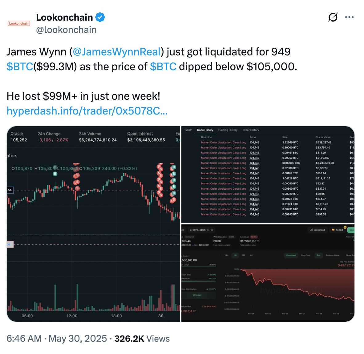 Day 8 (May 30): As Bitcoin dipped below $105,000, James Wynn was liquidated for 949 BTC worth $99.3 million.