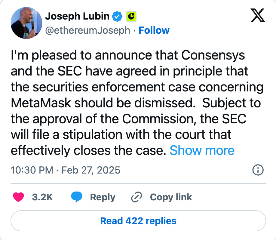 The SEC dropped the case with no fines or conditions, citing "a new direction" under Trump administration leadership. "Now we can get 100% back to building. 2025 is going to be the best year yet for Ethereum and Consensys," Lubin stated.