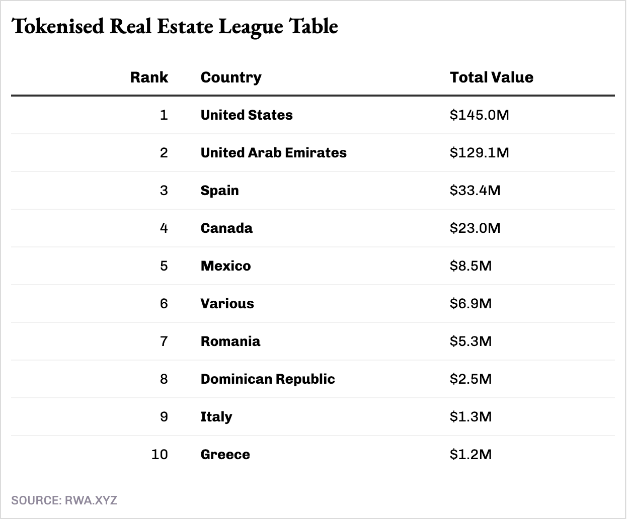 According to rwa.xyz, tokenised real estate, in its last five years or less has reached about $356 million in value, with most assets spread across USA and the UAE. For context, the Real Estate Investment Trusts (REITs) - fund managed real estate portfolios that trade on the stock exchange - in the USA it took 10 years after their launch in the 1960s for them to reach their first billion in Market Cap.