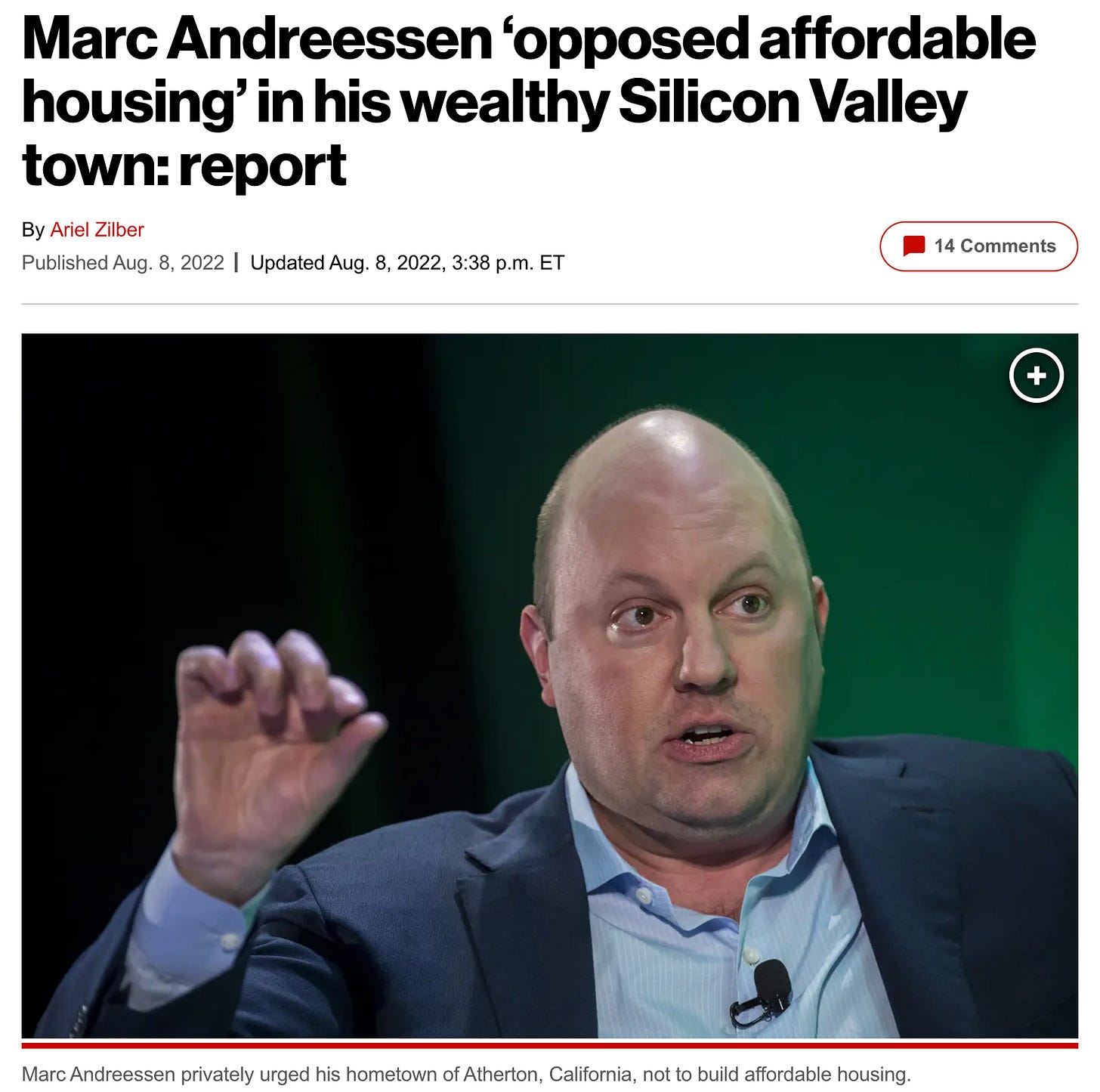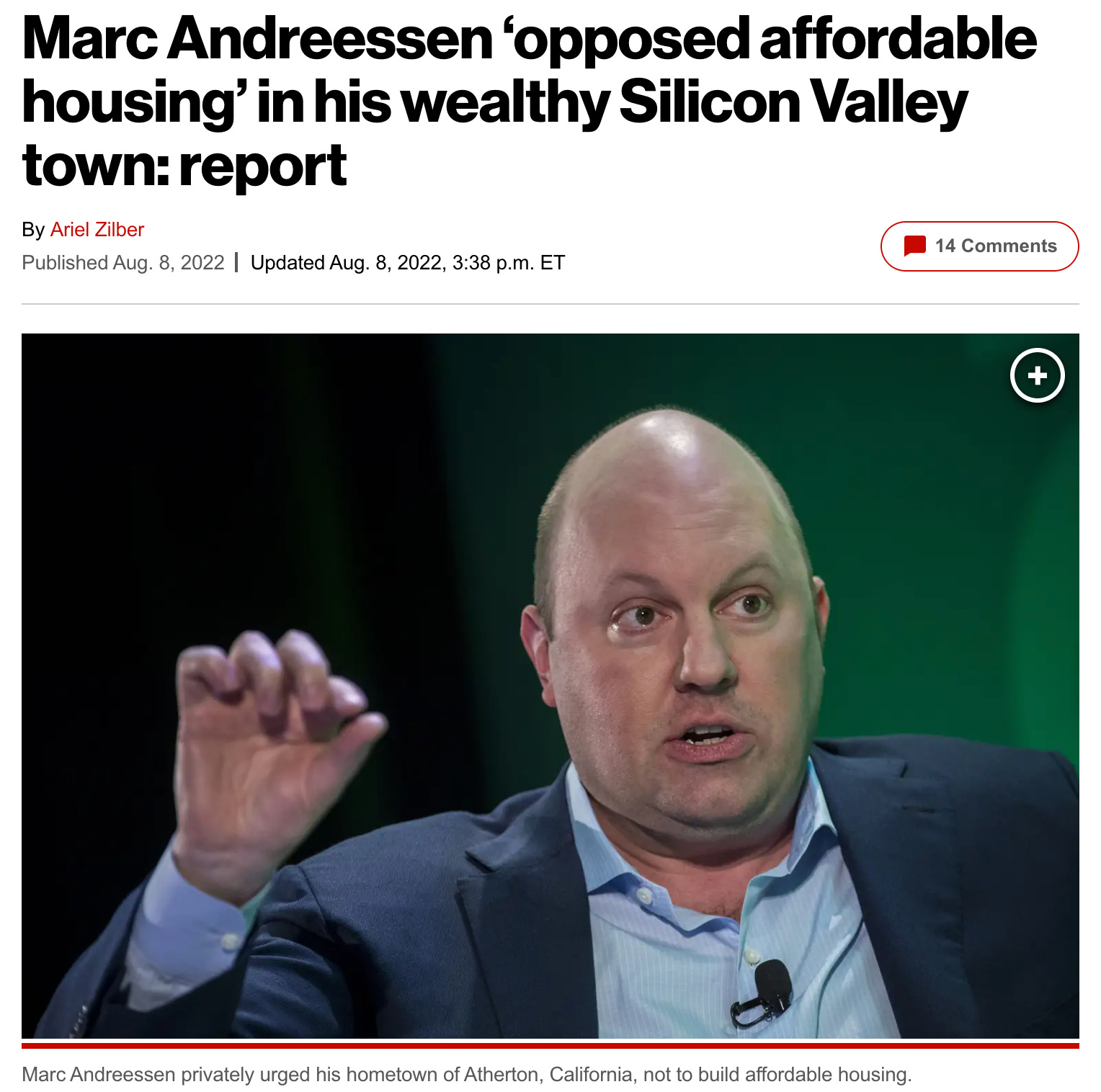 In August 2022, someone leaked a piece of correspondence that Marc Andreessen and his wife had sent to the mayor of Atherton, California. Atherton is the wealthiest zip code in America, with the median home selling for over $7 million. Marc Andreessen lives there.