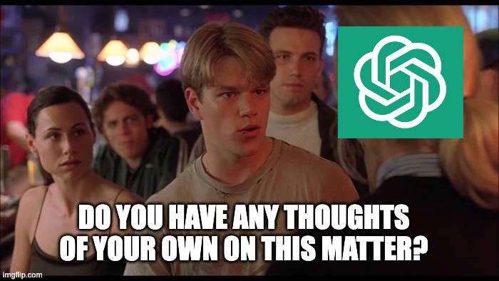 An analogy that I like to think about for LLM writing outputs is they’re similar to the bar scene from Good Will Hunting where there’s a dweebie Harvard student who presents what appears to be a fancy argument about US history, but it turns out he’s borrowing someone else’s thinking, and Will goes, “Were you going to plagiarize the whole thing for us? Do you have any thoughts of your own on this matter?”