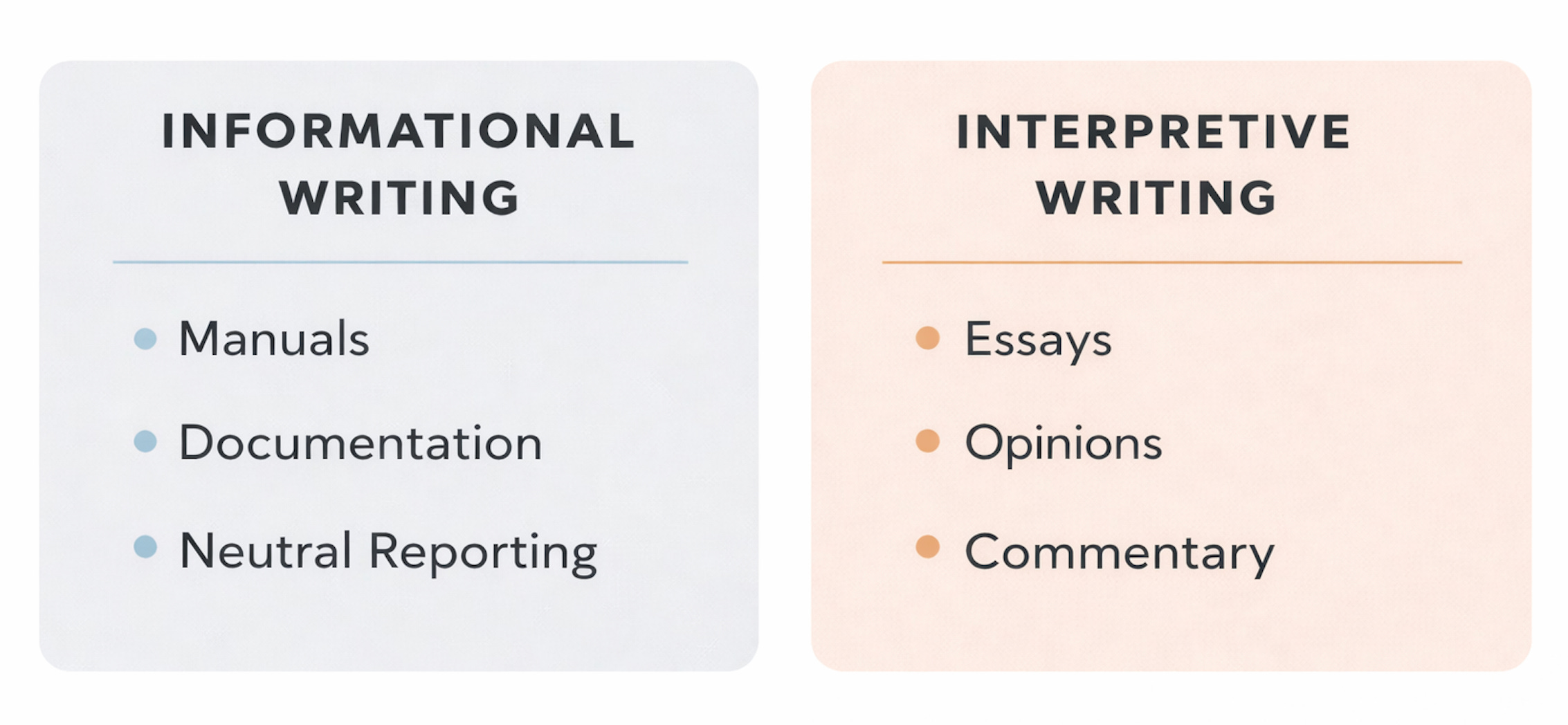 I realize that’s a broad starting point, so let’s go one level deeper and split writing into two sub-categories: informational writing and interpretive writing. Informational writing is about the transmission of facts. It’s the world of documentation, instruction manuals, and neutral reporting. Interpretive writing is about sharing a perspective. It’s the world of essays, opinions, and commentary.
