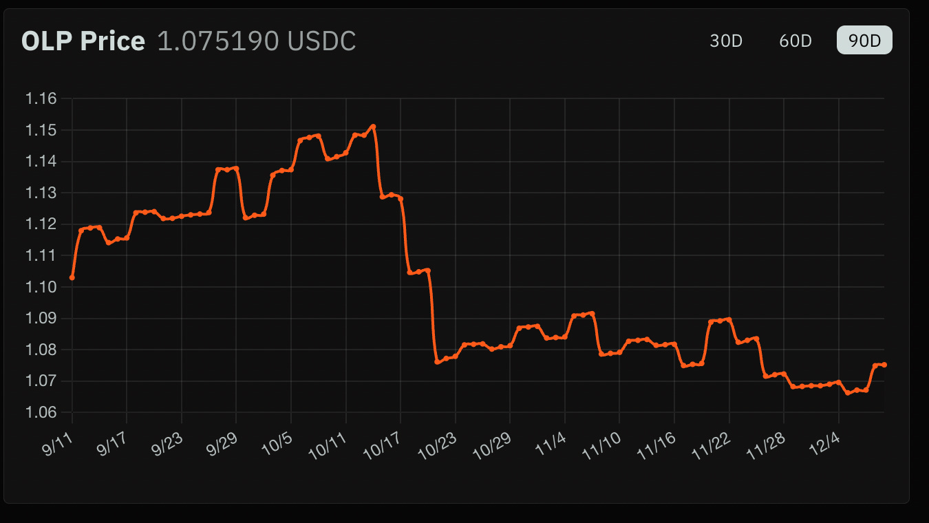 The Market Making Vault: This is where liquidity providers deposit USDC and earn yield. When you deposit here, you mint OLP tokens representing your share of the vault. The vault earns 50% of all opening fees and 100% of liquidation rewards. Current yields are running 15-18% APY, paid in actual trading fees, not token inflation.