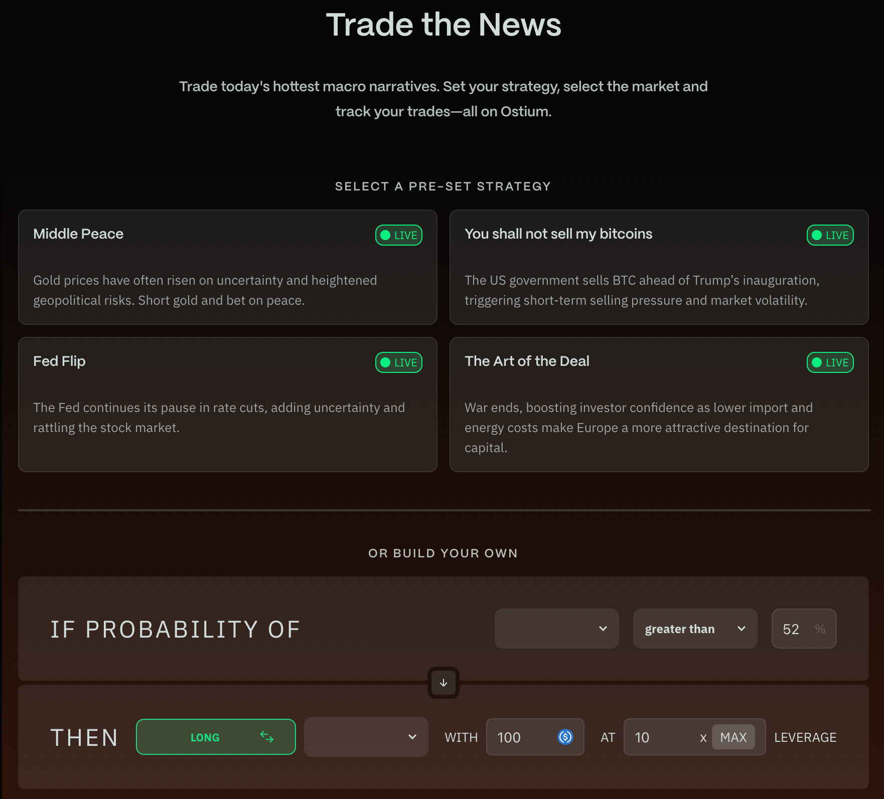 Ostium brings traditional markets on-chain. The platform offers perpetual contracts on commodities, forex, indices, and equities, all tracked by oracles and settled in USDC. You can trade gold or Tesla directly from your wallet with transparent fees and execution you can verify.