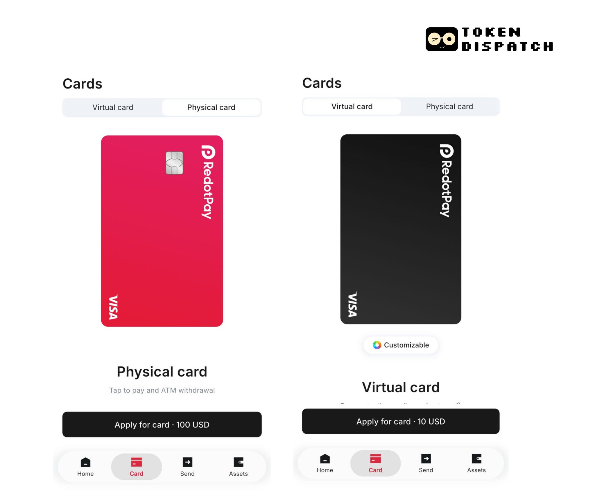 The core product is a Visa card. You can get a virtual card instantly after passing identity verification, or order a physical card for $100 that works at ATMs and point-of-sale terminals globally. When you swipe the card, RedotPay converts your crypto into the local fiat currency in real time and settles the transaction through Visa’s network.