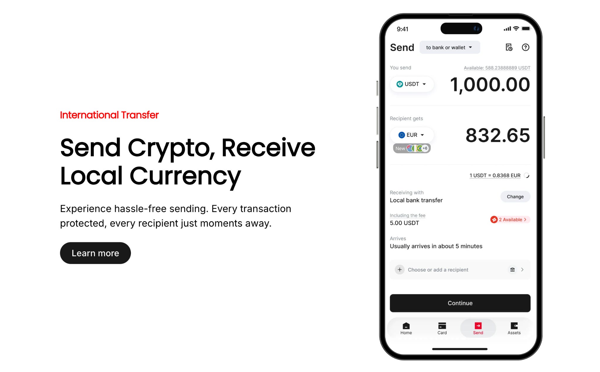The wallet supports Bitcoin, Ethereum, USDT, USDC, and a handful of other major assets. You can hold these alongside fiat balances in over 50 local currencies. The app lets you swap between them, send them to other users, or use them to fund your card.