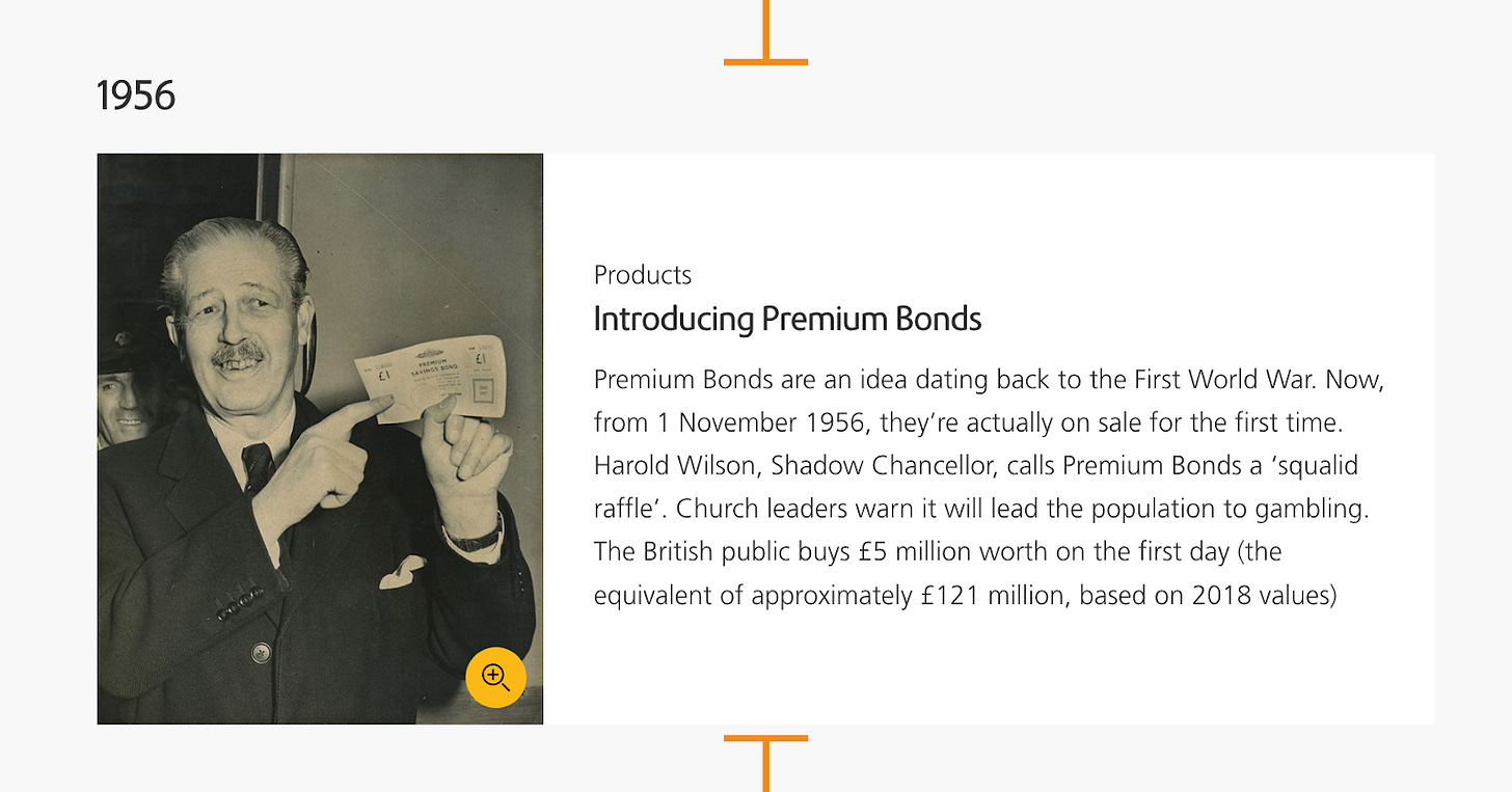 In 1956, Harold Macmillan, then Chancellor of the Exchequer, introduced Premium Bonds to the United Kingdom. Rather than distributing interest among depositors in a linear fashion, the government pooled all deposit yields and redistributed them as randomised prizes.