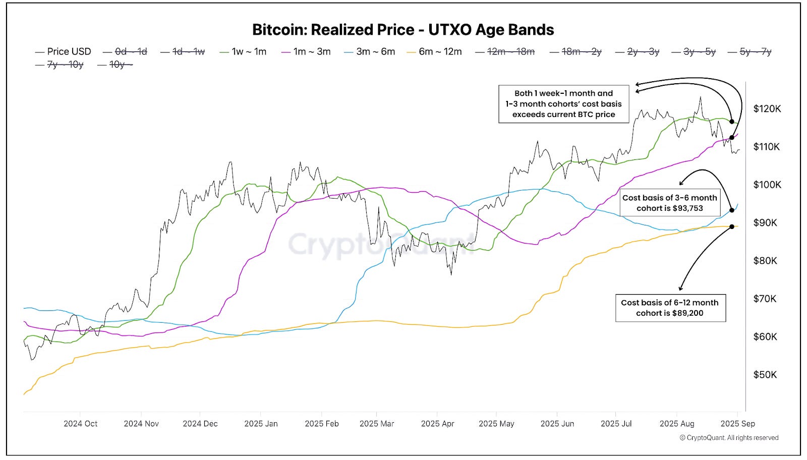 The realised price chart helps you understand this better as it reveals the situation that Bitcoin faces as it tests current support levels. The data shows a stark bifurcation between short-term and longer-term holder cost bases that creates significant vulnerability.