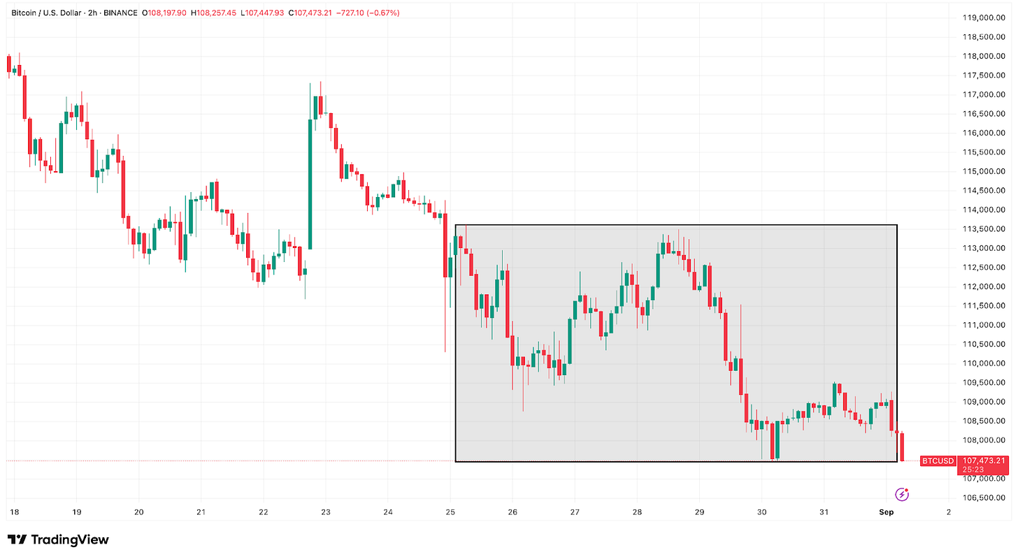 Bitcoin slipped below $110,000 on Friday and has since struggled to hold above it, resting in the $107K–$110K band, the same support it last tested in early July. That puts BTC down more than 13% in just over two weeks from its ~$124,400 peak.