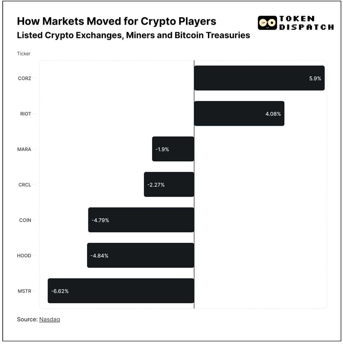 Crypto-exposed stocks delivered a decidedly mixed week, with mining companies outperforming while exchanges and treasury firms faced selling pressure.