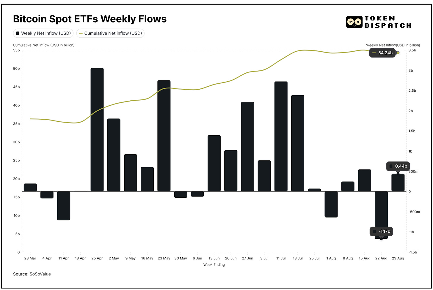 The only consolation through the week were Bitcoin Spot ETF flows. They made a moderate comeback turning net positive last week, $440 million, after the preceding week saw $1.17 billion in redemptions.