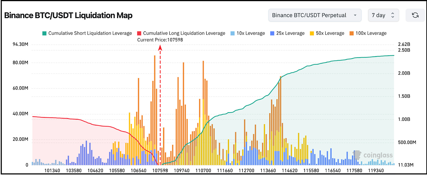 The $110,700 level represents a massive liquidation wall with over $750 million in short leverage, which if breached could spark explosive upward momentum toward $116,000. However, the heavy concentration of leveraged shorts above $110,000 also explains why any relief rally faces immediate resistance, as these positions add selling pressure once squeezed.
