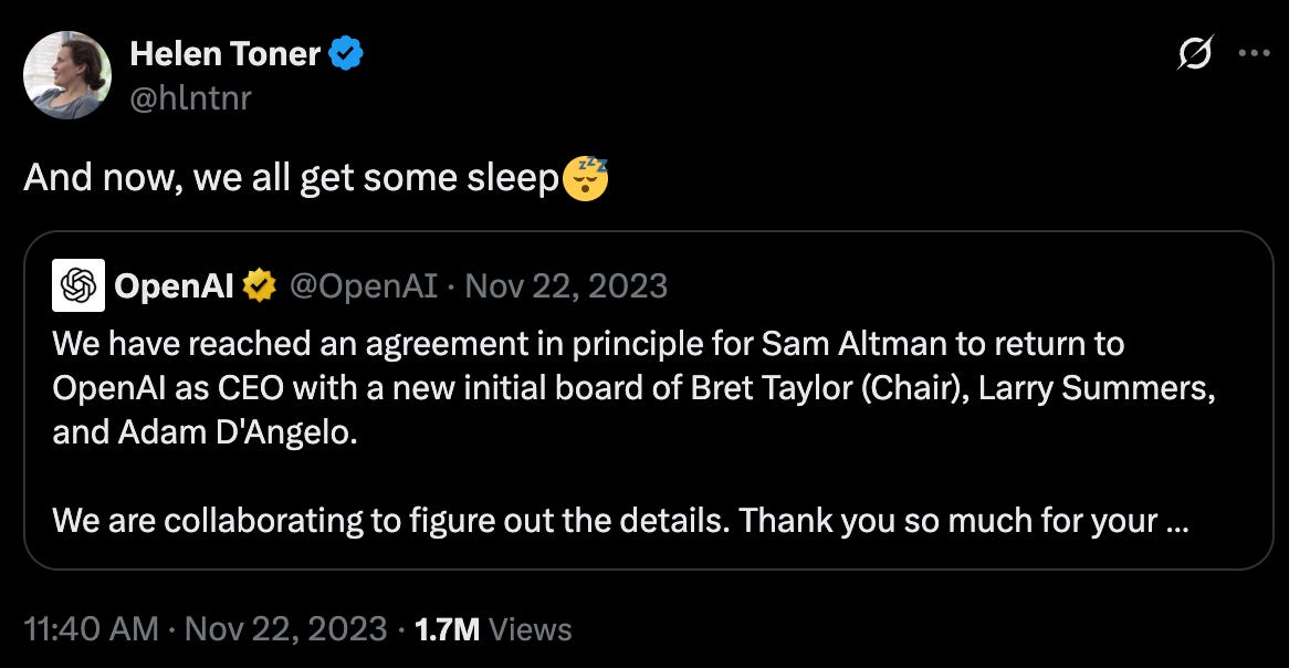 On November 22, Altman returned as CEO. The board that had fired him resigned. A new board with experienced tech executives took over, including former Salesforce CEO Bret Taylor and former Treasury Secretary Larry Summers.