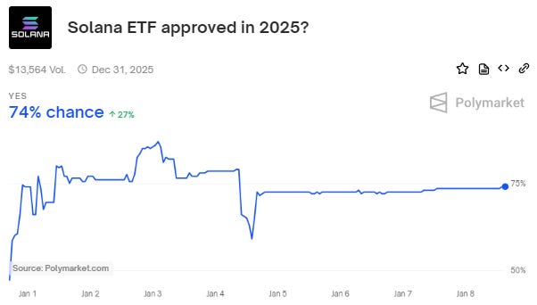 The odds of a Solana ETF approval in 2025 are at 85% on Polymarket.