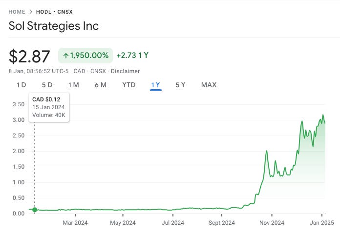 Sol Strategies, the MicroStrategy for Solana, saw its share price shoot up from 0.12 Canadian dollar to 3.02 CAD in 2024.