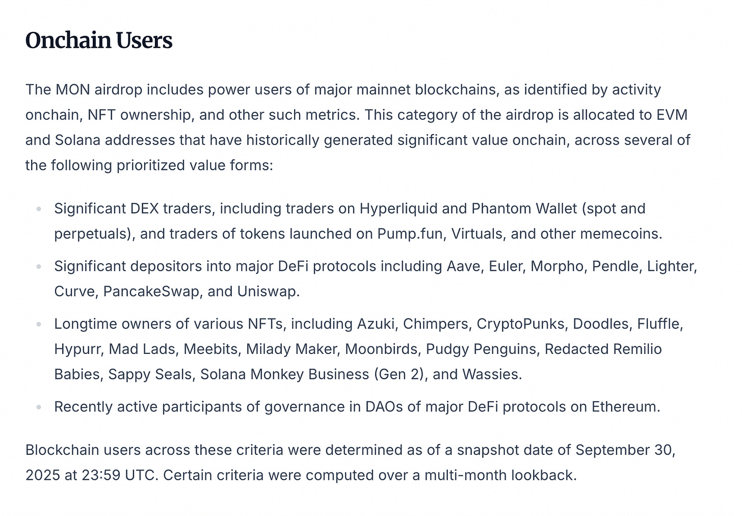 Their logic seems alright. Don’t reward bots and grinders who run ten wallets for every protocol, and avoid the scenario where half the supply ends up in Sybil farms — groups where a single entity uses fake identities to gain disproportionate influence on a network. Instead, Monad’s airdrop mechanism wanted to reward “real” users with on-chain history, meaningful DeFi exposure and maybe an NFT habit.