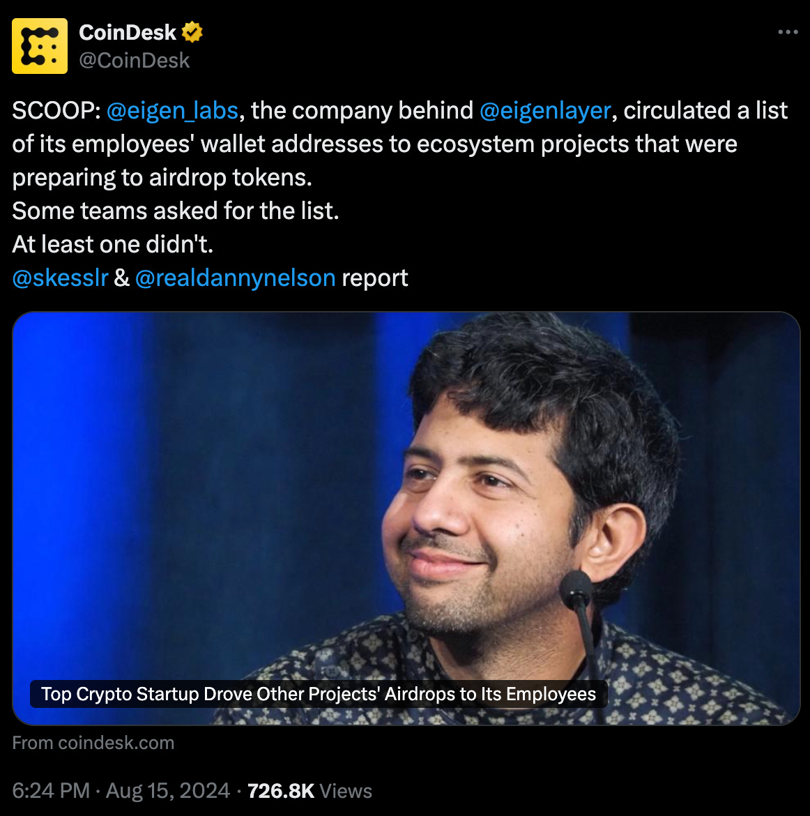 Then came the conflict of interest scandal. In August 2024, CoinDesk reported that Eigen Labs employees had received nearly $5 million in airdrops from projects building on EigenLayer. Employees collectively claimed hundreds of thousands of tokens from projects like EtherFi, Renzo, and Altlayer. At least one project felt pressured to include employees in their distributions.
