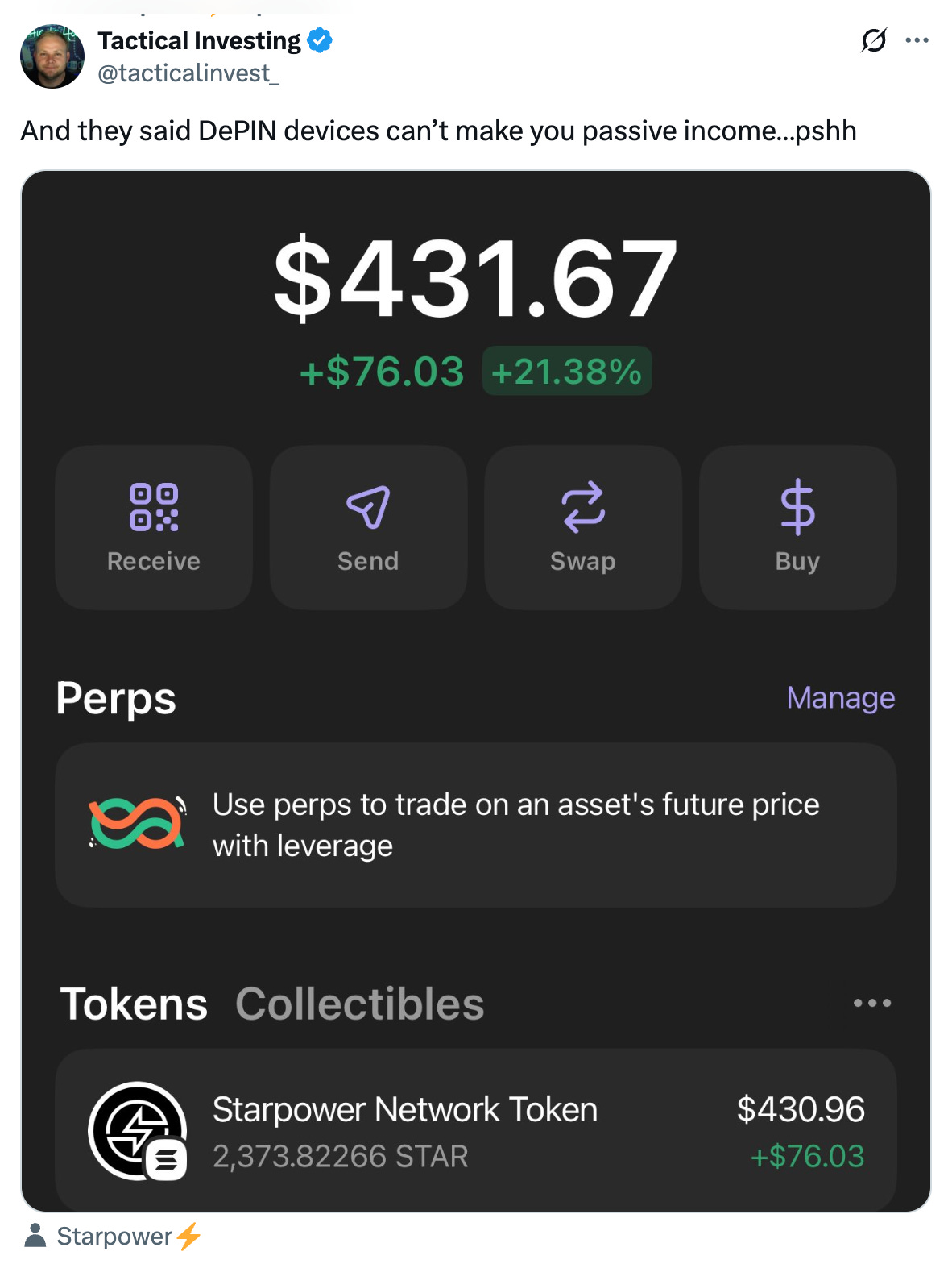 Currently, you receive STAR tokens weekly. During testnet, early users accumulated tStar tokens at roughly 22 STAR per week per device. With mainnet now live, those tokens are tradeable.