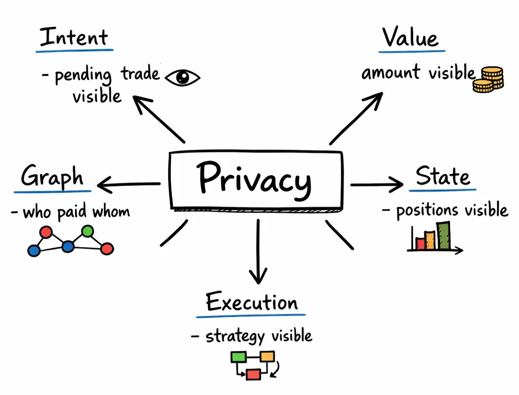 Intent privacy ends when the block is published. After inclusion, the chain reveals what it always has unless you pair it with on-chain privacy for values, state, or execution.