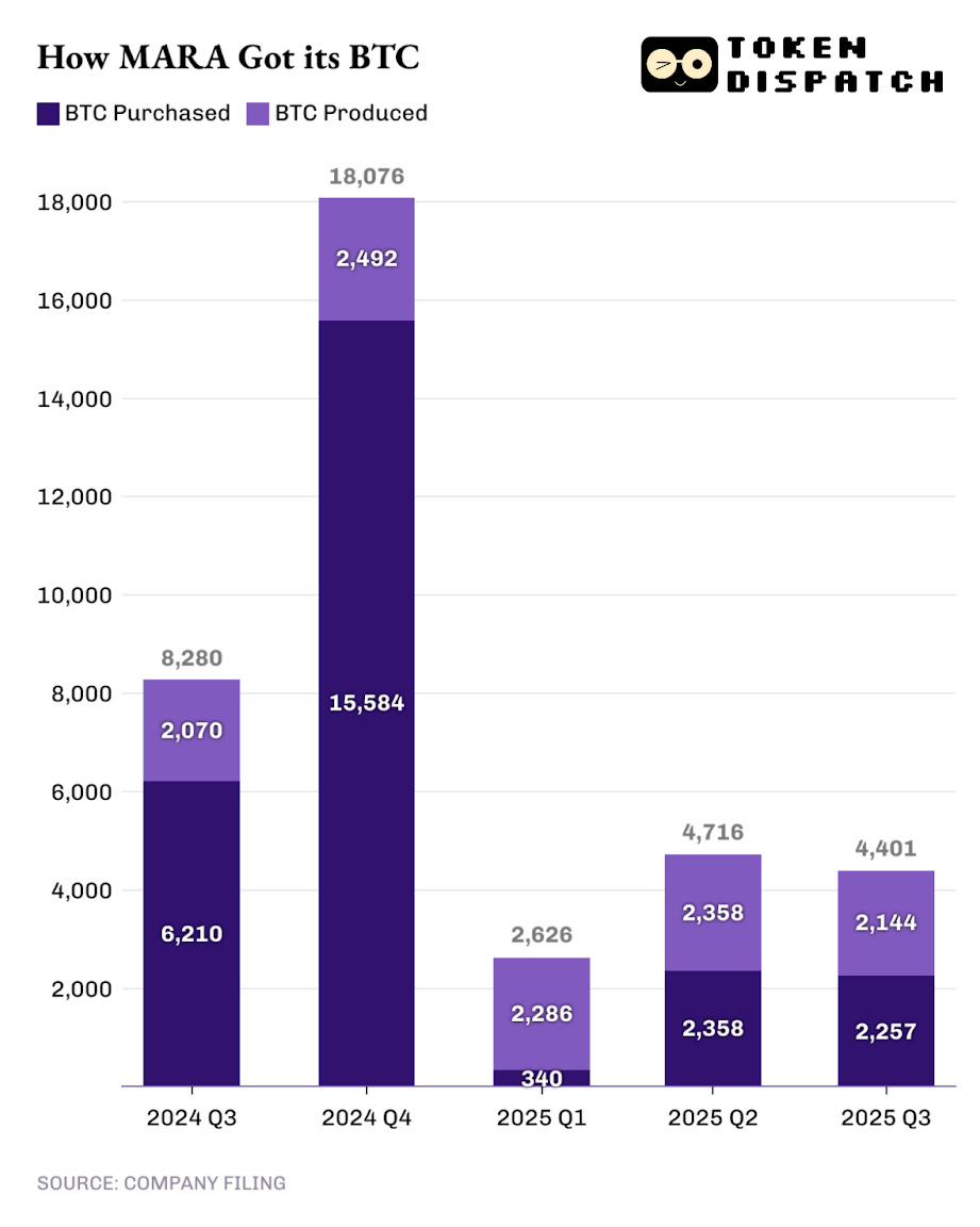In contrast to Strategy, Marathon acquires its BTC through both mining and open-market purchases. In Q3 2025, MARA mined 2,144 BTC and purchased 2,257 BTC from the market.