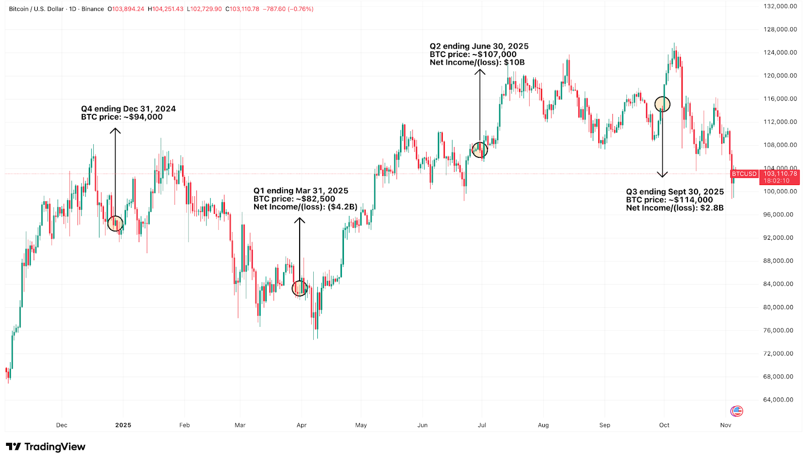 It suffered losses when it dipped below $85,000 in March, followed by profits in Q2 and Q3 when BTC closed above $107,000 and $114,000 on June 30 and September 30, respectively. The business now operates in complete sync with Bitcoin’s price cycles, buying consistently, but never selling.