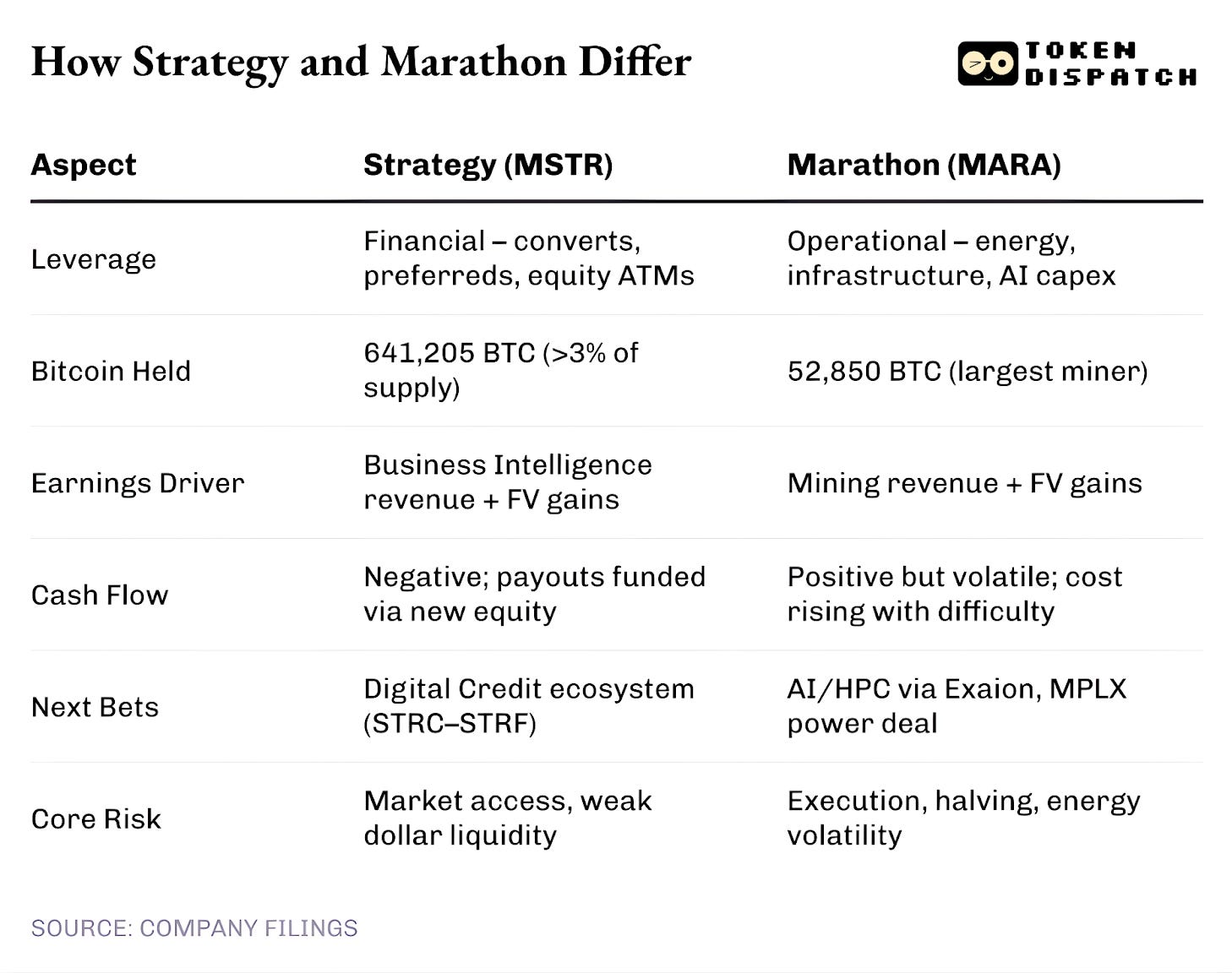 Strategy calls BTC “digital capital” and uses it to issue perpetual preferred equity that behaves like yield-bearing bitcoin bonds. Marathon uses its computing infrastructure not only to mine and earn yield from BTC, but also to expand its revenue lines across AI and enterprise cloud businesses.