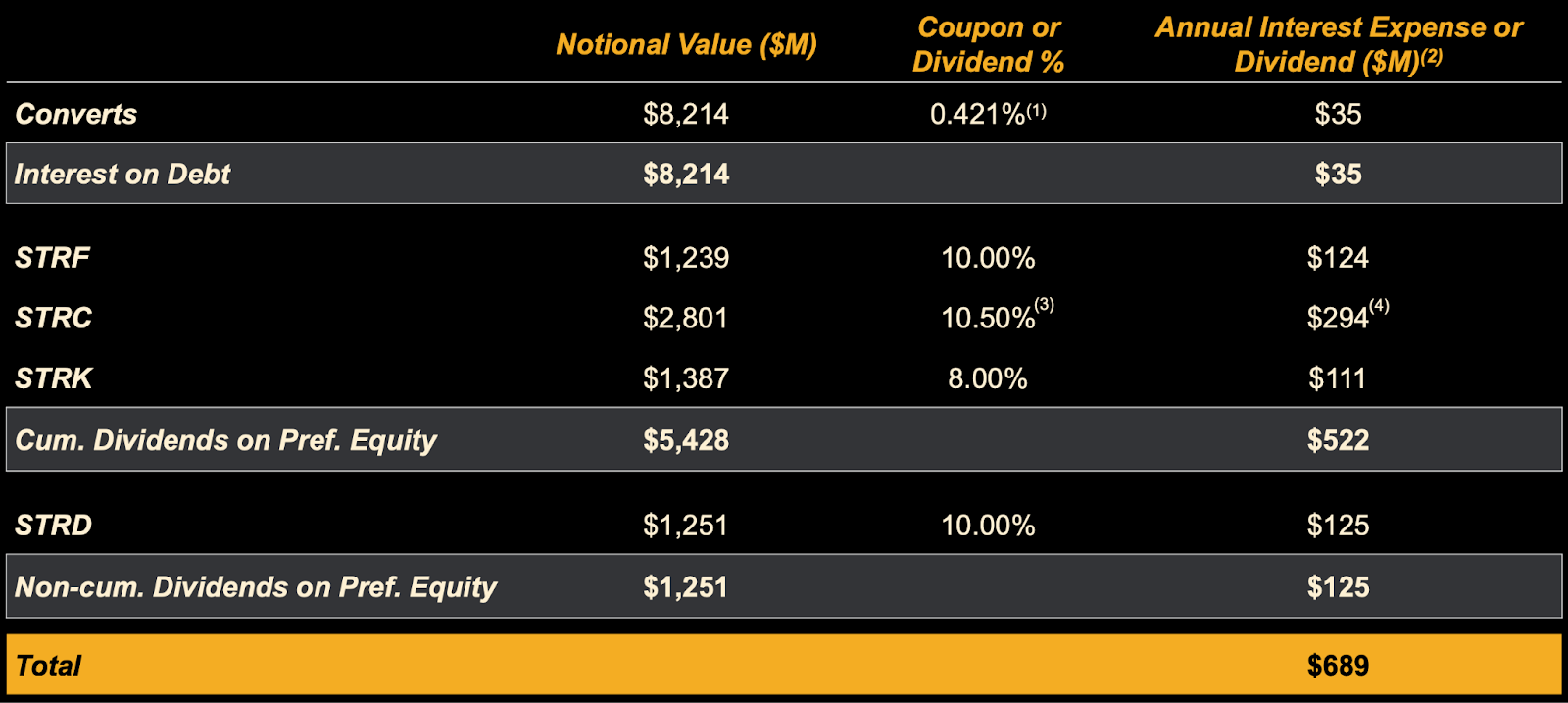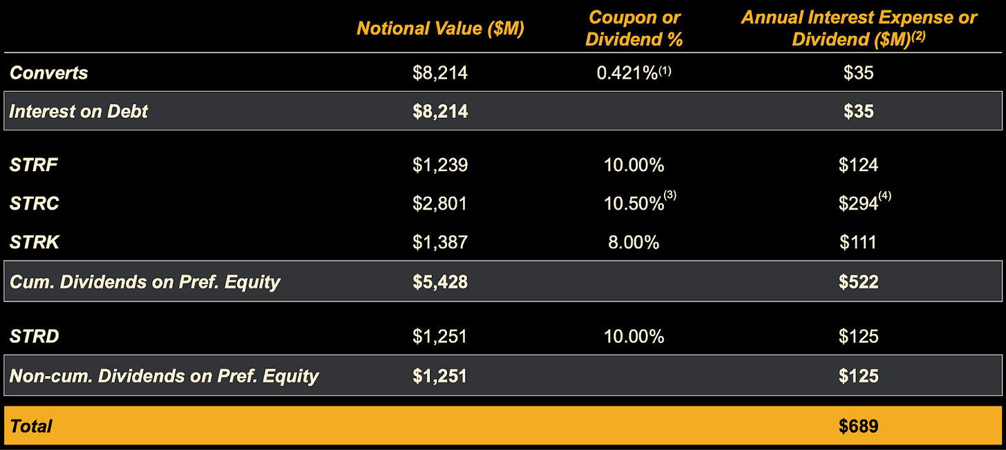 Collectively, the cost of convertible debt and equity requires Strategy to pay about $689 million in annual interest and dividends.