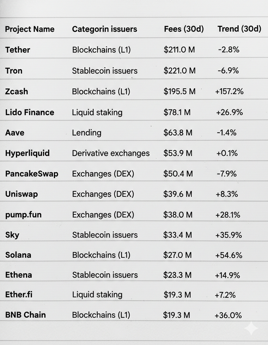 That shows up clearly in the data. Stablecoin issuers dominate crypto’s fee map. Tether alone generates roughly $400 million a month in fees, with Circle close behind. Even newer issuers like Sky and Ethena are climbing the rankings.